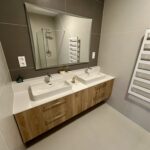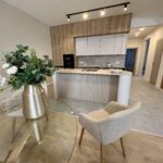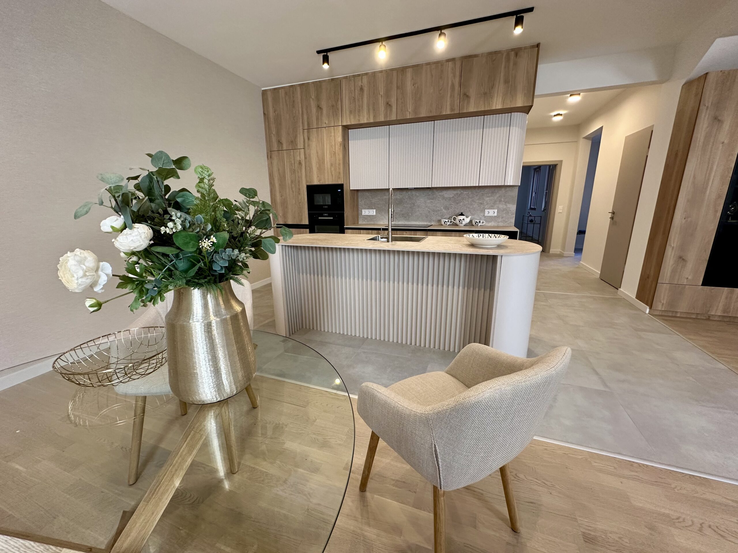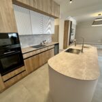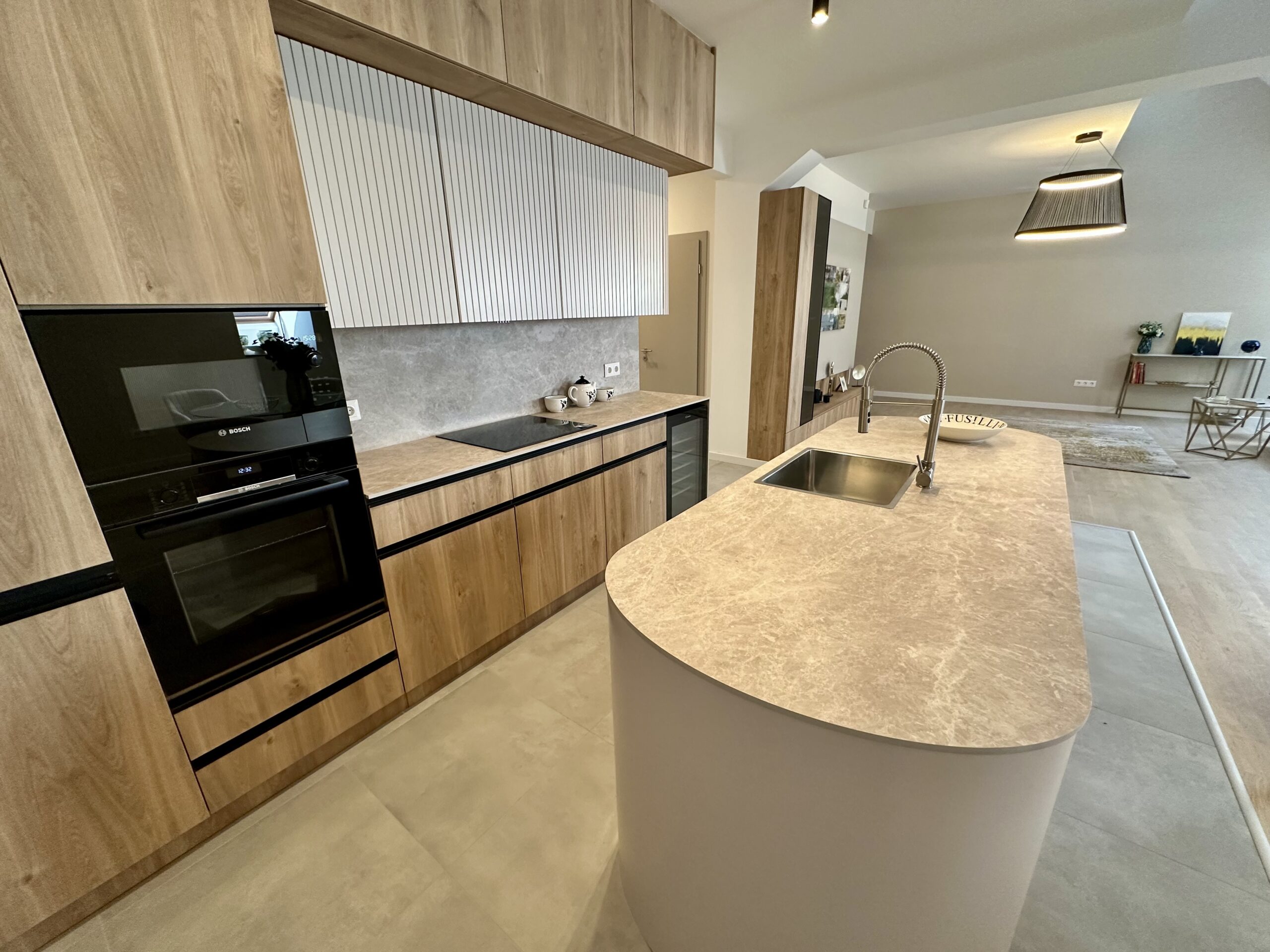 Custom-made kitchen furniture with built-in appliances (fridge, oven, cooktop, built-in microwave, wine cooler, extractor fan, dishwasher)