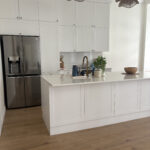– amerikai konyhás nappali modern, gépesített, egyedileg tervezett konyhabútorral