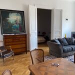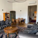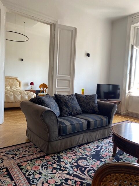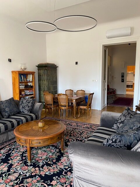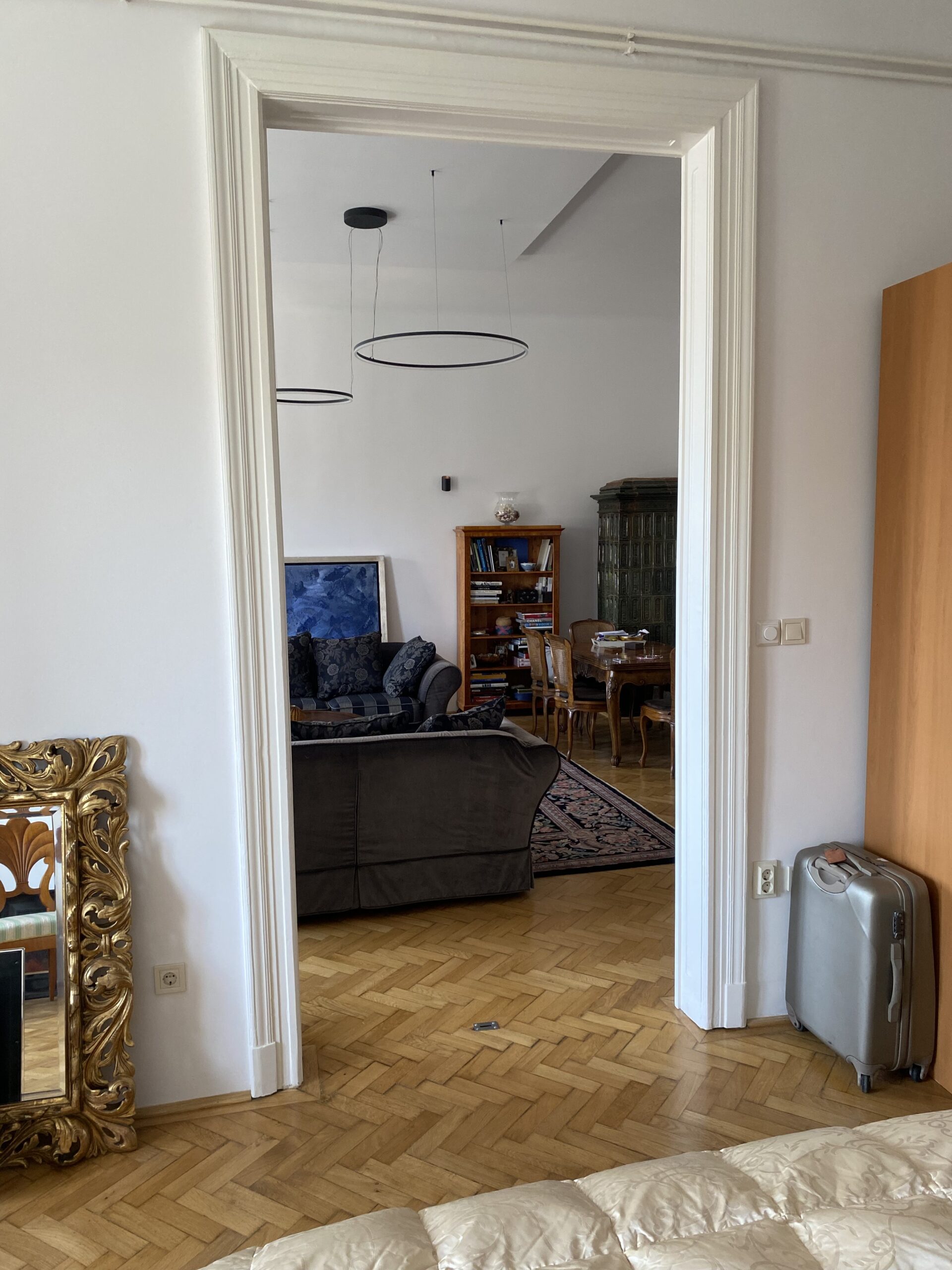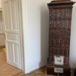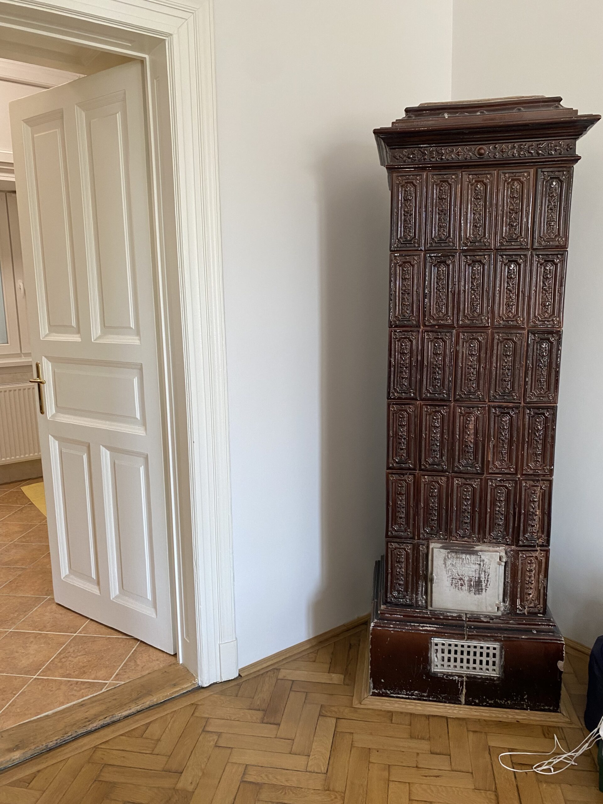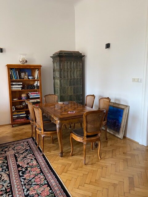 The apartment has high ceilings, giving it a true bourgeois atmosphere. Two of the larger rooms feature stylish tiled stoves as decorative elements, though they are not currently connected to the chimney and cannot be used.
