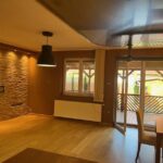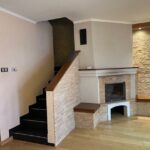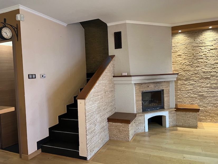 A nappaliban kandallón és a lépcsőfeljárónál elegáns kőburkolat díszíti a falakat.
