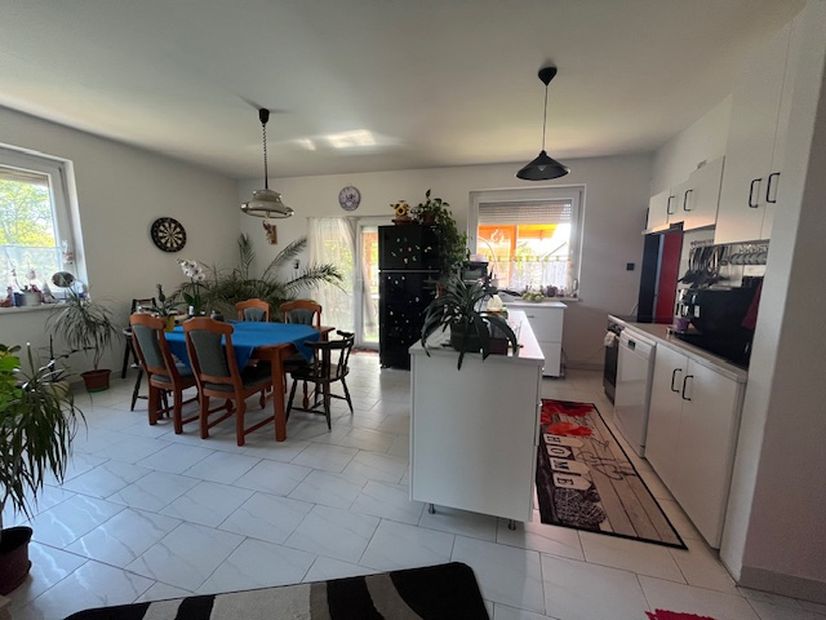Elosztás:földszinten előtér,nappali,nahy étkezős konyha gépesítve,konyha szigettel ellátva,fürdőszoba,külön wc.Étkezőből fedett terasz nyílik.