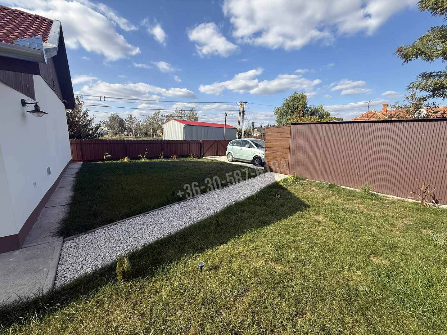Az udvar parkosított, kamerarendszerrel ellátott és rendelkezik egy önállő garázzsal, egy 15m2-es tárolóval és egy 10m2-es fedett terasszal.