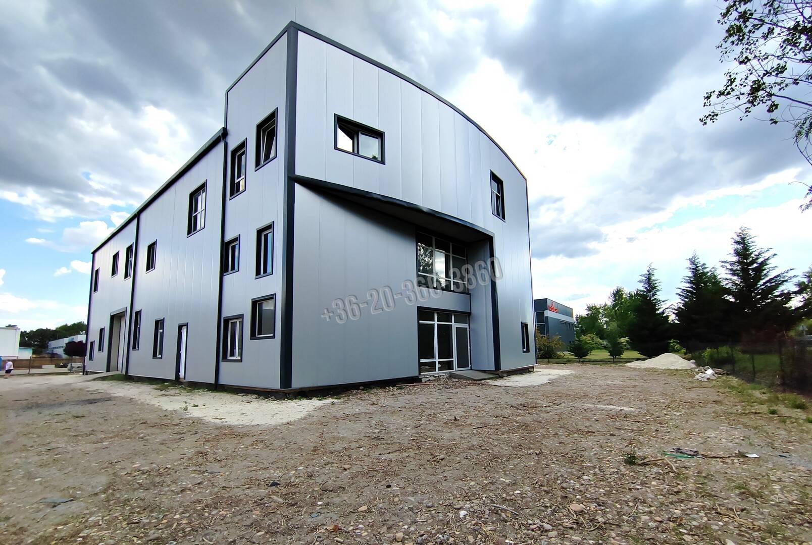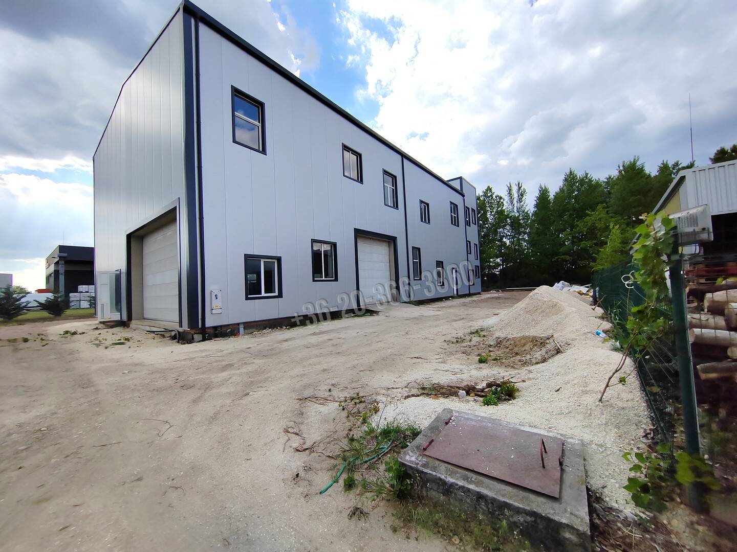 Az épület egy 5,5 m széles saját útról közelíthető meg.
