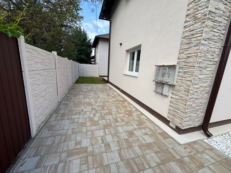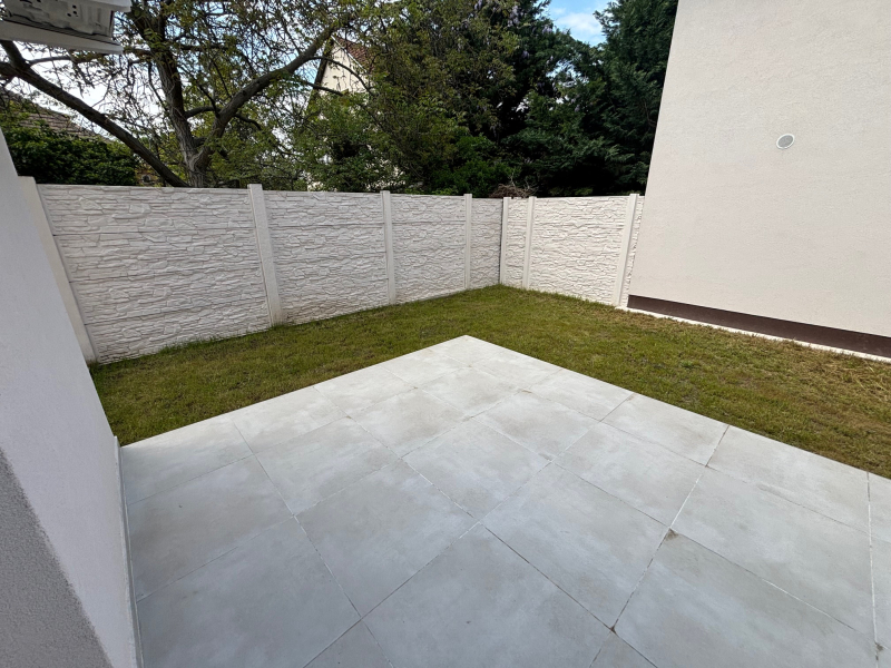 Magas kerítéssel körbekerített saját kerttel rendelkezik ( burkolt terasz kb 12nm + 180nm füvesített kert ), ami intim és biztonságos.