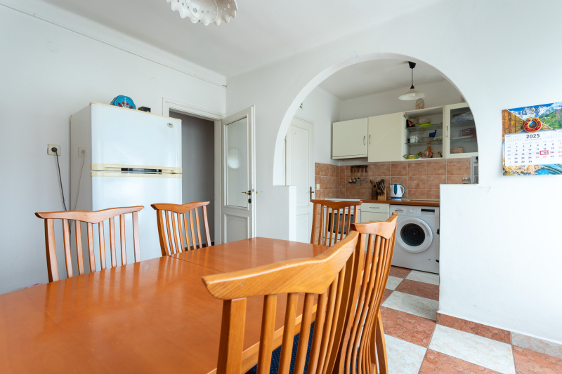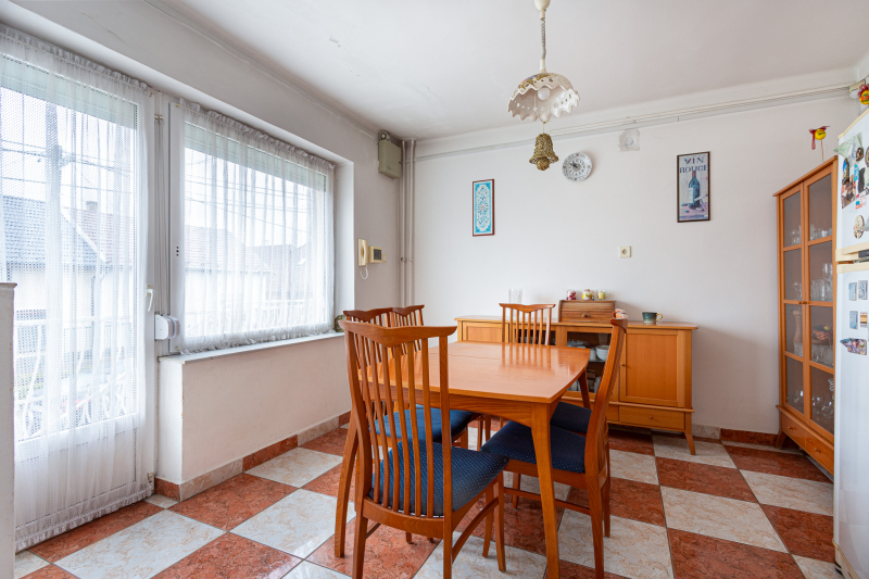 A földszint 112,77 m2 (nappali + 2 szoba, konyha-étkező, kamra, fürdő-wc, külön wc, beépített terasz-előszoba, közlekedő, erkély, nyitott terasz.)