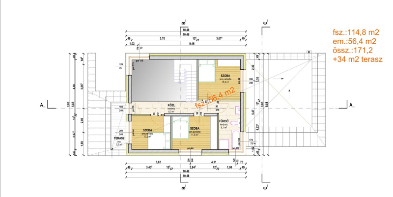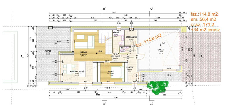 A ház nettó alapterülete 135 nm + 36 nm garázs, 34nm terasz.