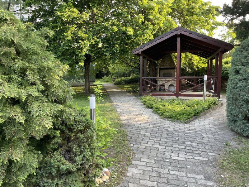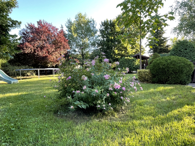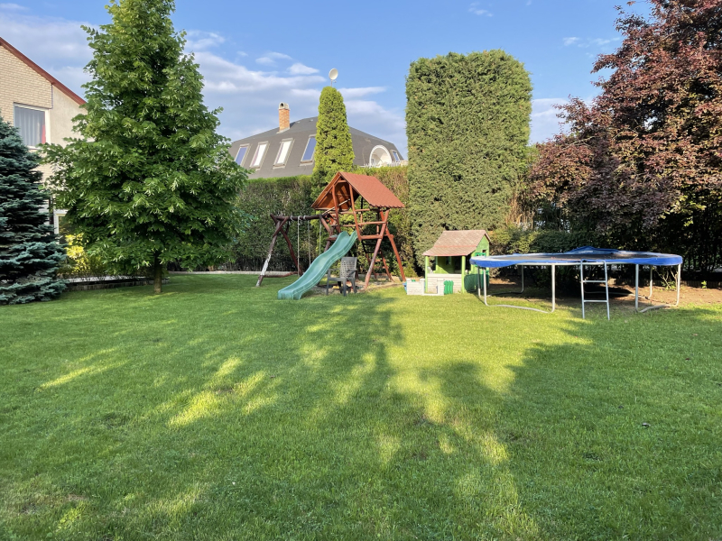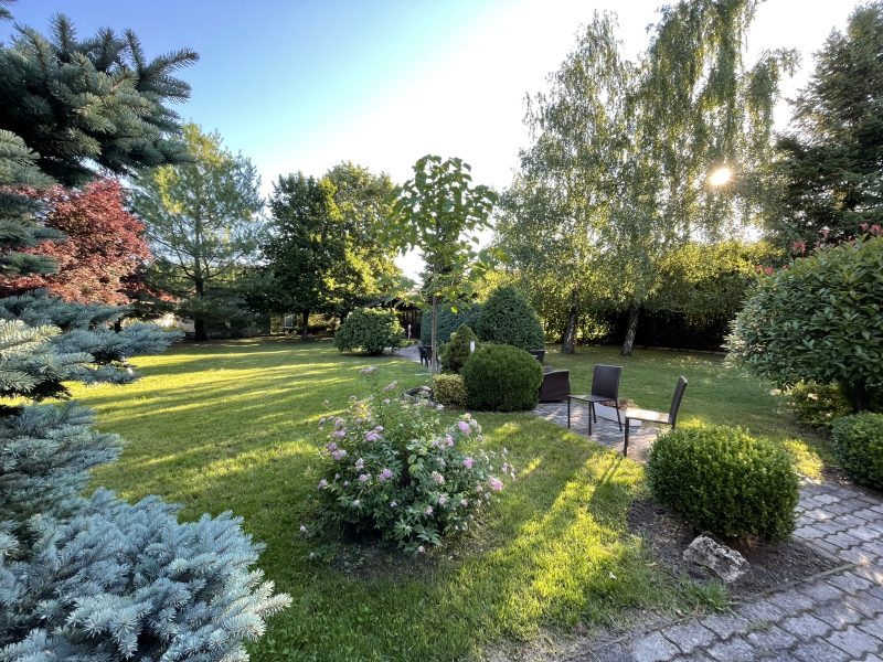 A hatalmas kertben közel negyed évszázados fák, színes bokrok és a kerítés mellett az évek alatt magasra nőtt sövény igazi feltöltődésre alkalmas békés, diszkrét menedéket nyújt a hétköznapok zűrzavarában.