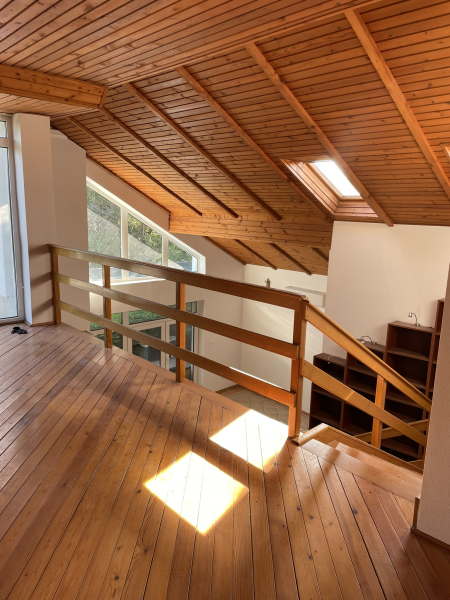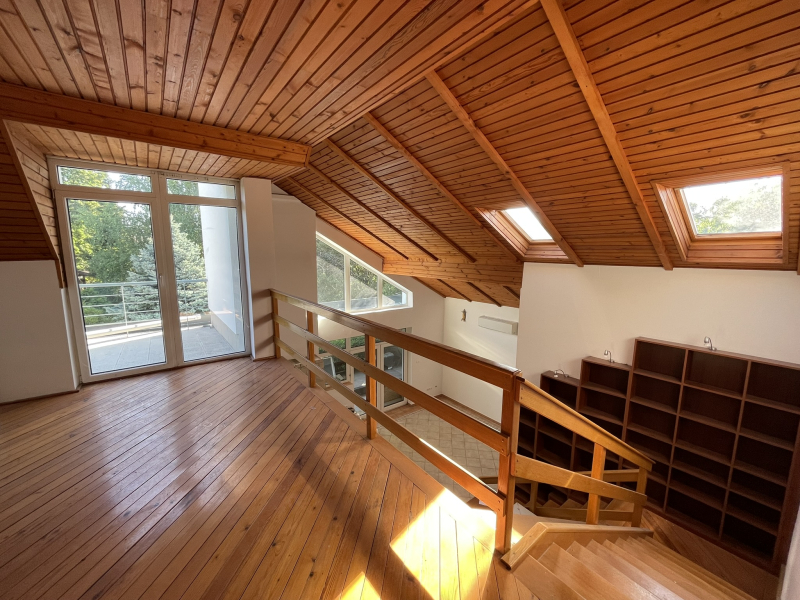 A szobák és a vizes helyiségek mind egy tágas és fényes galériáról nyílnak, amelyről a nappalira is remekül lelátni.