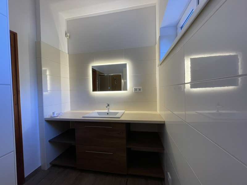 A konyhából nyílik a kamra, a nappaliból pedig egy kisebb fürdő, melyben a WC mellett helyet kapott egy zuhanykabin is.