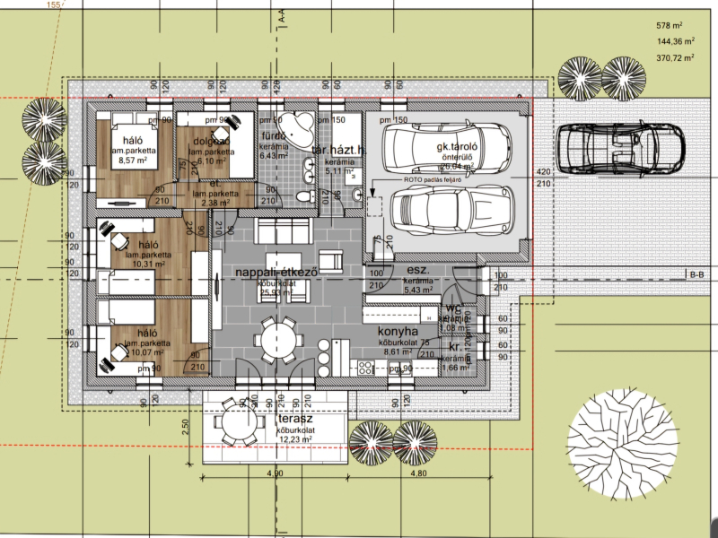 Kiváló adottságú telek előnyeit figyelembe véve alaposan átgondolt tervezés alapján épül az ingatlan benapozottsága optimális.