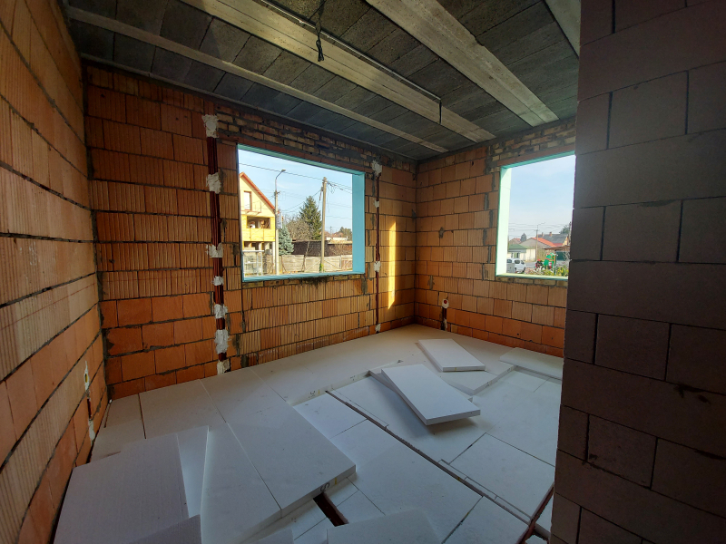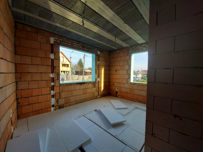 A ház 30-as tégla falazattal, 15 cm-es hőszigeteléssel, a bukó-nyíló műanyag nyílászárók 3 rétegű 5 légkamrás kivitelezésűek, elektromos redőnnyel a nappaliban.