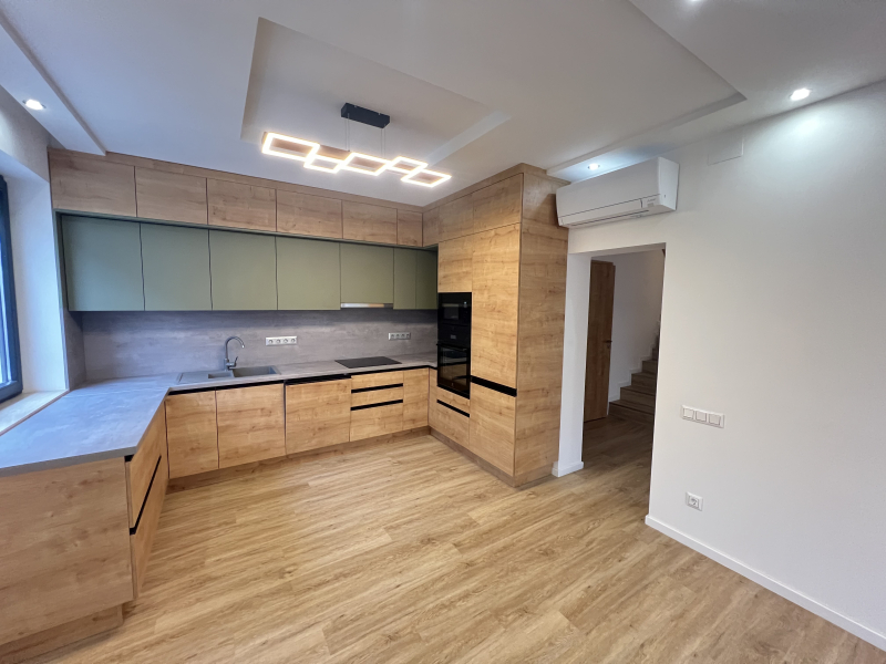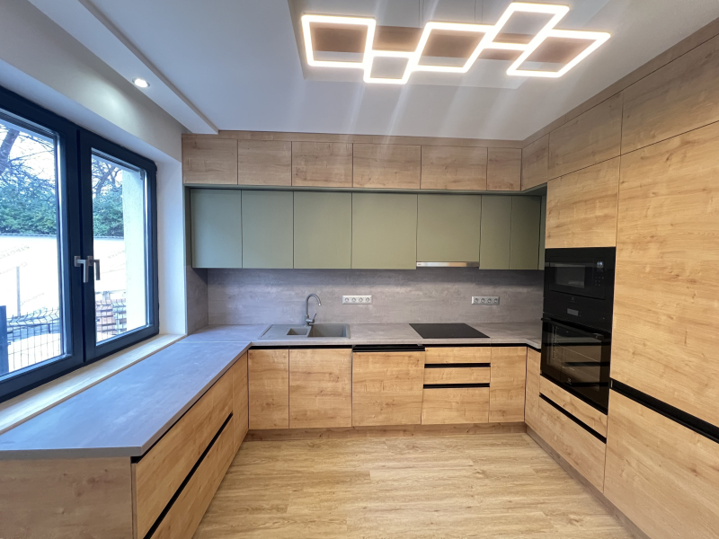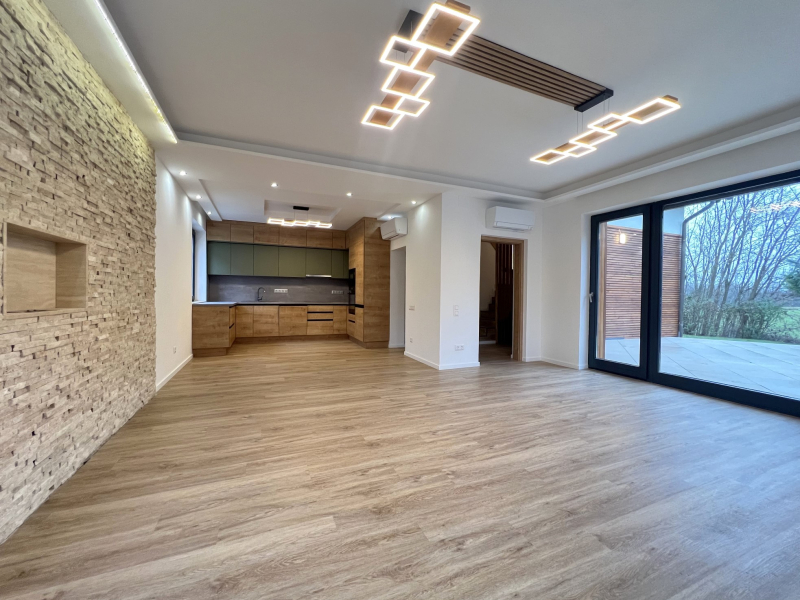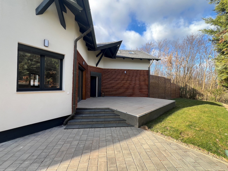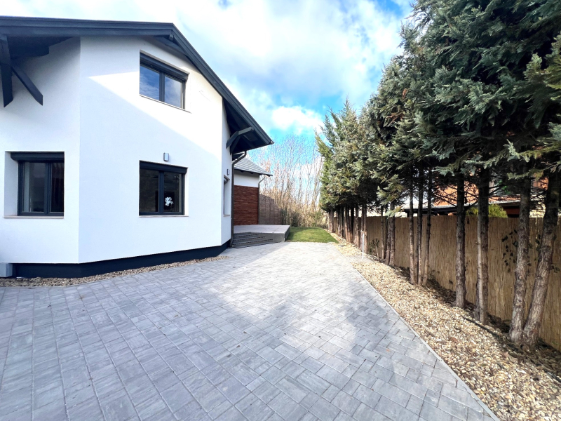 Beépített, egyedi gyártású, gépesített konyhabútorral, 318 nm-es telekkel, kerttel, 2 autó beállására alkalmas térkövezett felszíni beállóval.