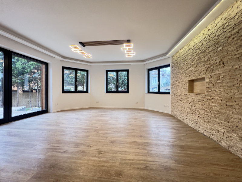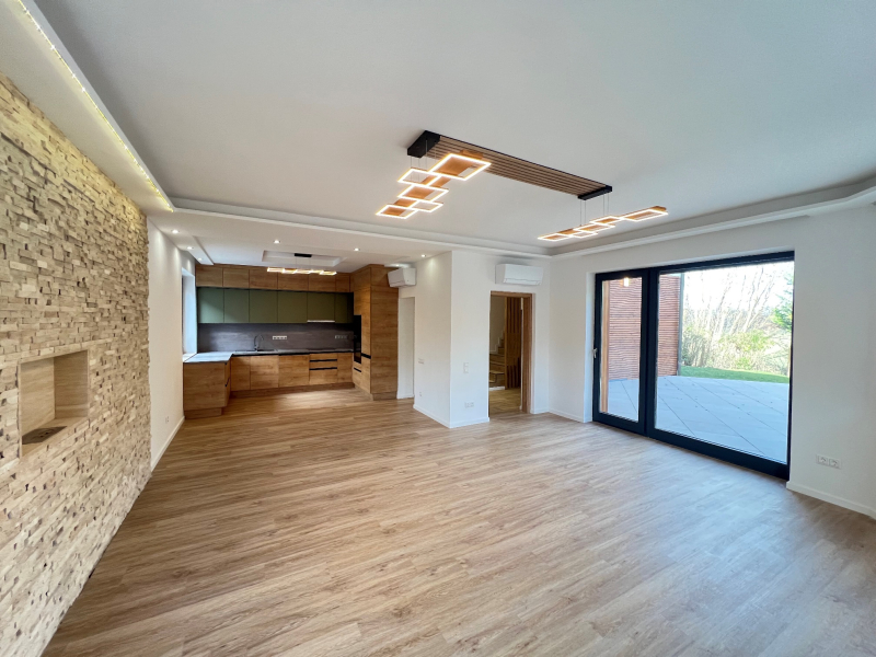 A földszinten található a tágas amerikai konyhás nappali, ahonnan nyílik a több mint 30 nm-es terasz, valamint egy wc.