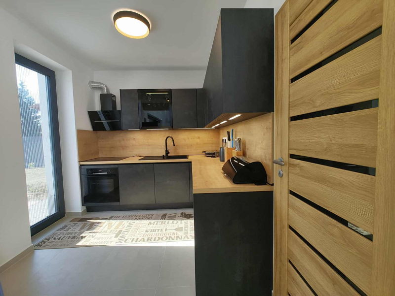 Antracit színű, melegperemes, három rétegű üvegezésű, hőszigetelt, műanyag nyílászárók (rejtett tokos elektromos redőnnyel), a terasznál toló kivitelben