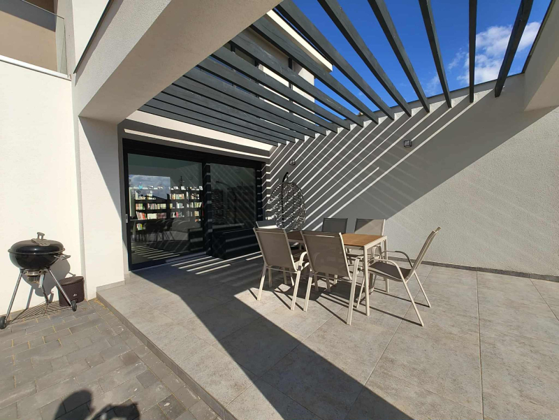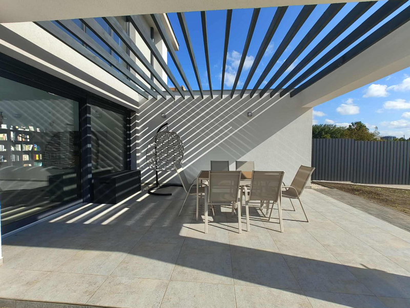 Antracit színű, melegperemes, három rétegű üvegezésű, hőszigetelt, műanyag nyílászárók (rejtett tokos elektromos redőnnyel), a terasznál toló kivitelben