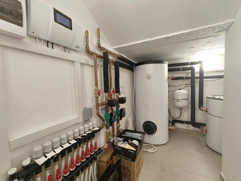 Az épület fűtését (minden helységben padlófűtés) 1db 11 kW-os levegős hőszivattyú biztosítja Nappaliban és a szobákban split klíma biztosítja a hűtést