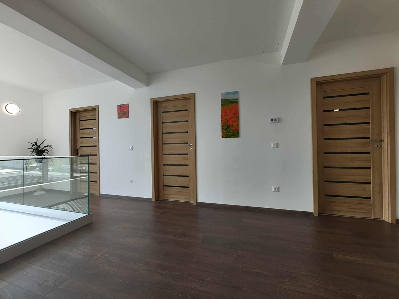 Emeleten: 3 szoba, 2 fürdőszoba, 2 terasz.