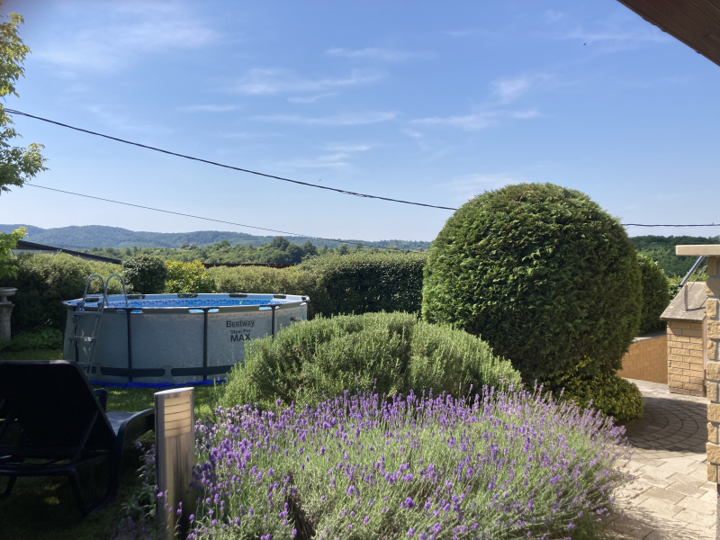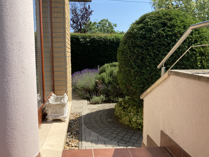 A kertépítő által tervezett kert gyönyörűen teraszosított és parkosított, sütögetővel, dísznövényekkel és gyümölcsfákkal, de van hely a medencének is. Öntözőrendszer és kerti csap segíti a kertészkedést.