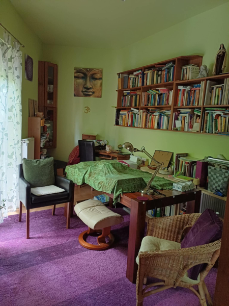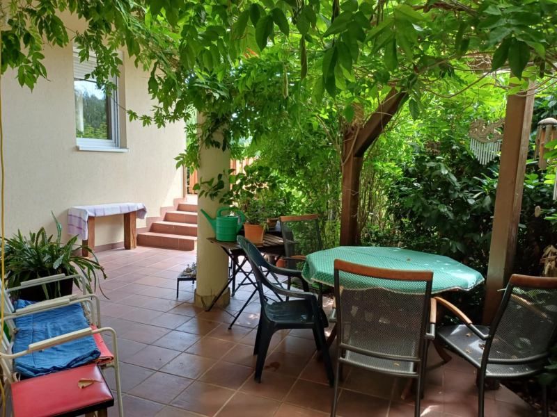 Az egész telek telis-tele van gyönyörű növényekkel (gyertyán, galagonya, ringló, tiszafa, hársfa, ginkgo, füge, cseresznye-, meggyfa, vérszilva, színes virágok, stb. :)). Még gyógynövényes rész is helyett kapott a kertben. Hangulatos kis kiülős részek vannak az érett növényzet között. 🙂