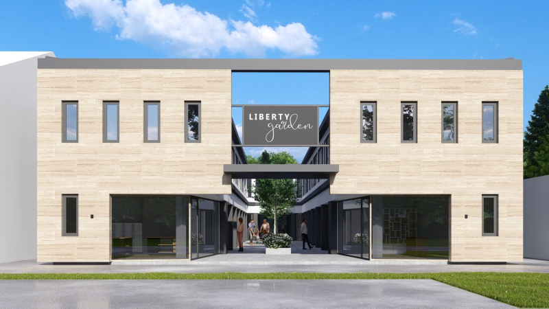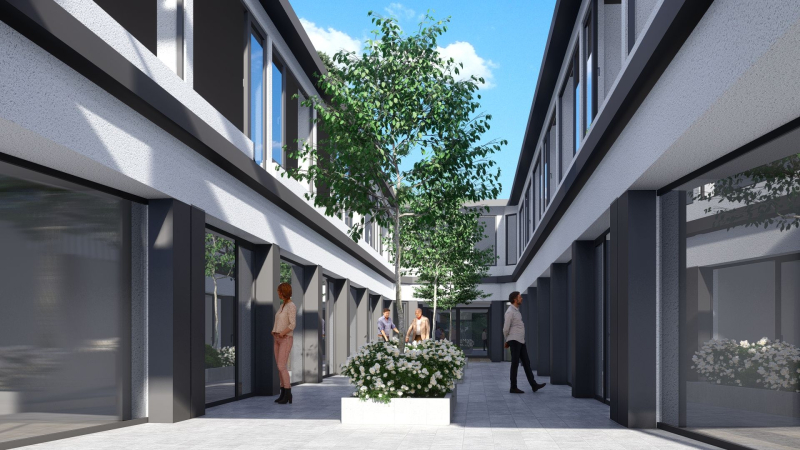 – térkővel burkolt közös udvar, növényzettel, pihenővel