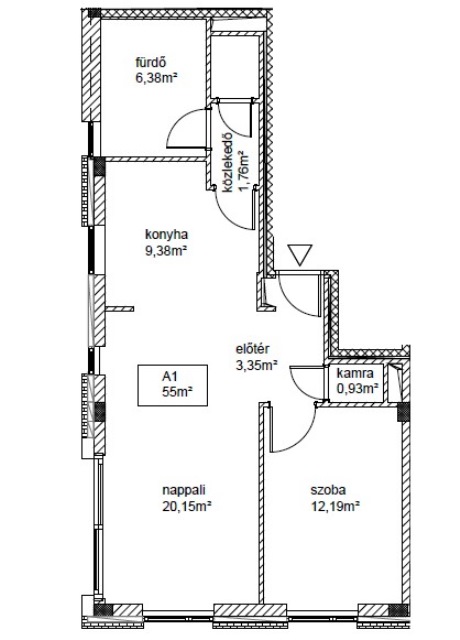 Ez a lakás 55 nm-es, nappali + 1 hálószobás, 1 fürdővel + 1 külön toalettel.