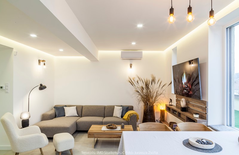 Az apartman egy klasszikus épület legfelső emeletén található , és nagyszerű kilátást nyújt a Deák Ferenc térre és parkra valamint a Gellért- és Várhegyre.