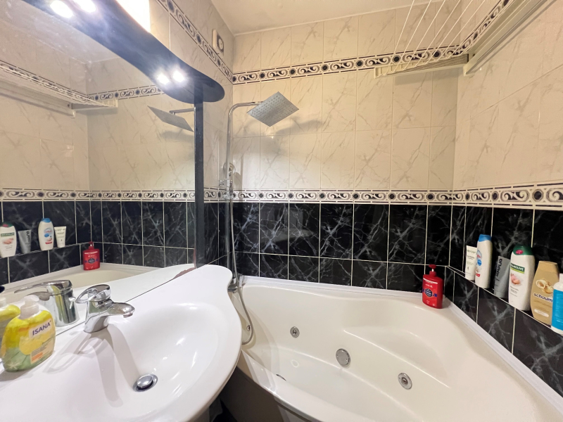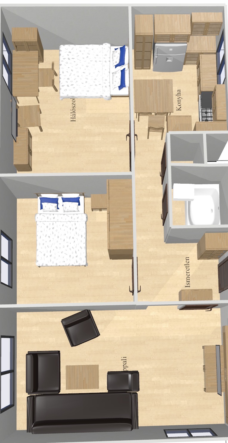 A közlekedőn át nyílik az egyik 11nm-es hálószoba, tovább haladva a sarokkádas fürdőszoba, a wc külön helyiségben található. A közlekedőből nyílik az ablakos gépesített, konyha étkező. A konyha mellett a tágas 16 nm-es hálószoba.