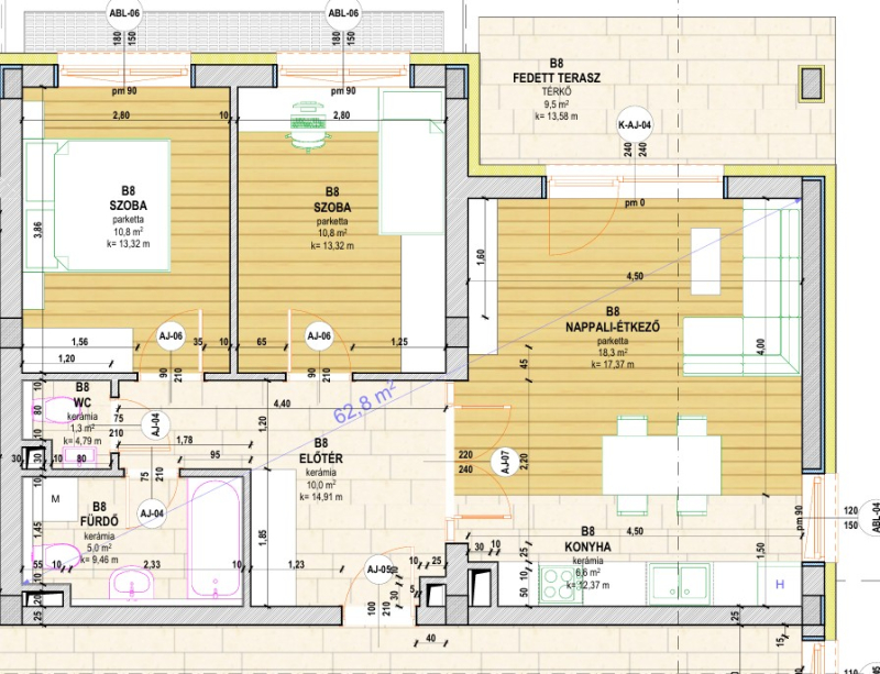 (változtatható)A nappali és a hálószobák laminált parketta padlóburkolattal, az egyéb helyiségek hálósan rakott mázas kerámialap padlóburkolattal készülnek. A WC-k és fürdőszobák falain 2,20 m magasságig, a konyhákban a tervezett beépítésnek megfelelően az alsó és felső elemek közti 60 cm magasságú sávban készül (mindenhol hálós formációban rakva) csempeburkolat. Az alábbi m2 anyag áru burkolatokat tartalmazza a lakás vételára: