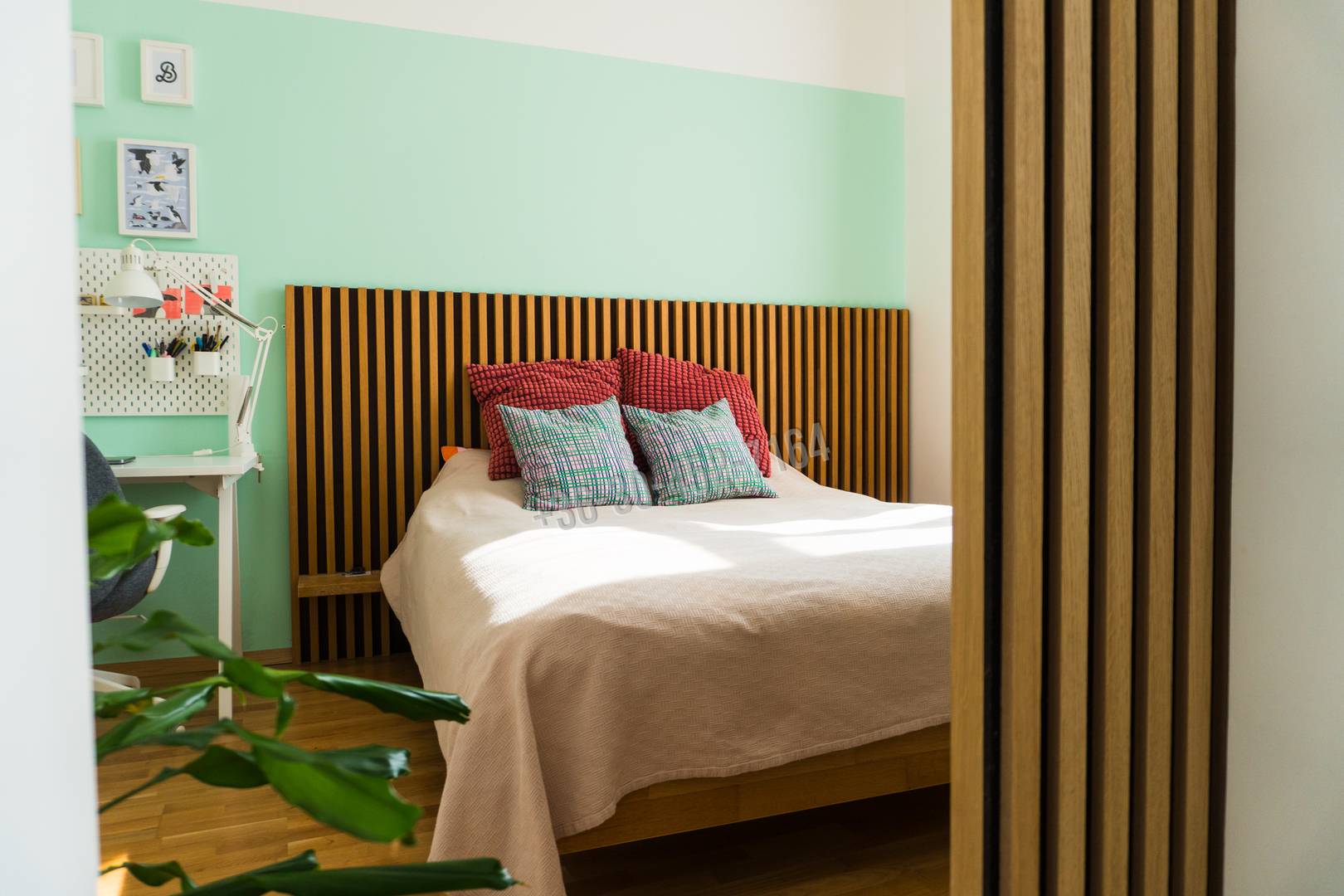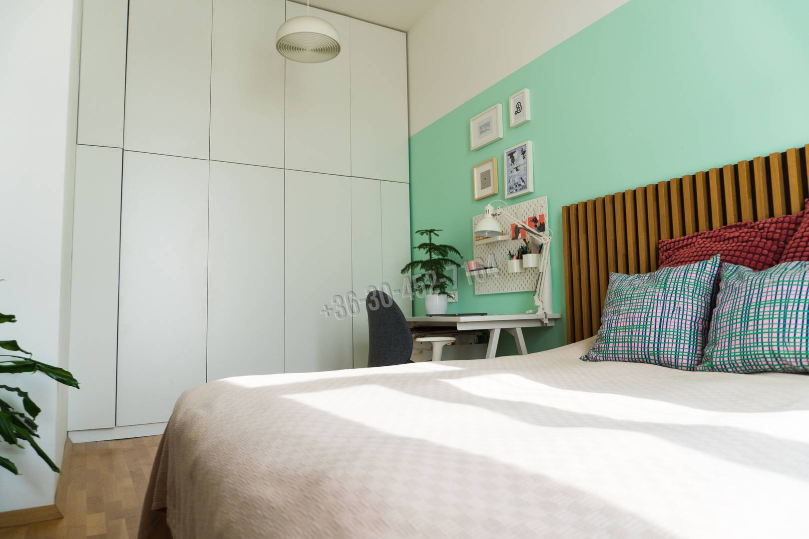 A hálószobában és az előszobában a padlótól a plafonig érő beépített szekrény található, amiben a kazán, a mosógép és a szárítógép is szépen el lett rejtve.