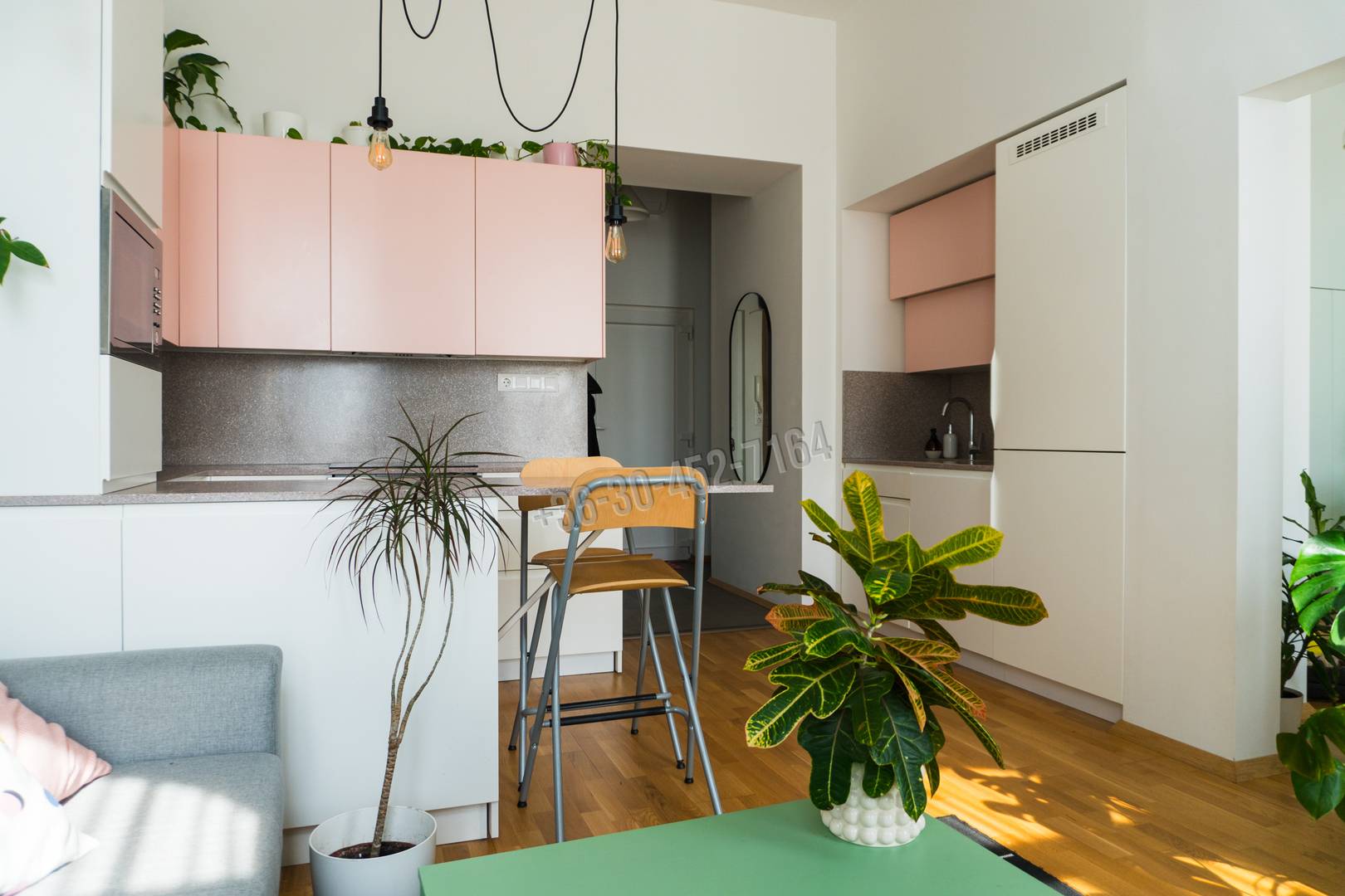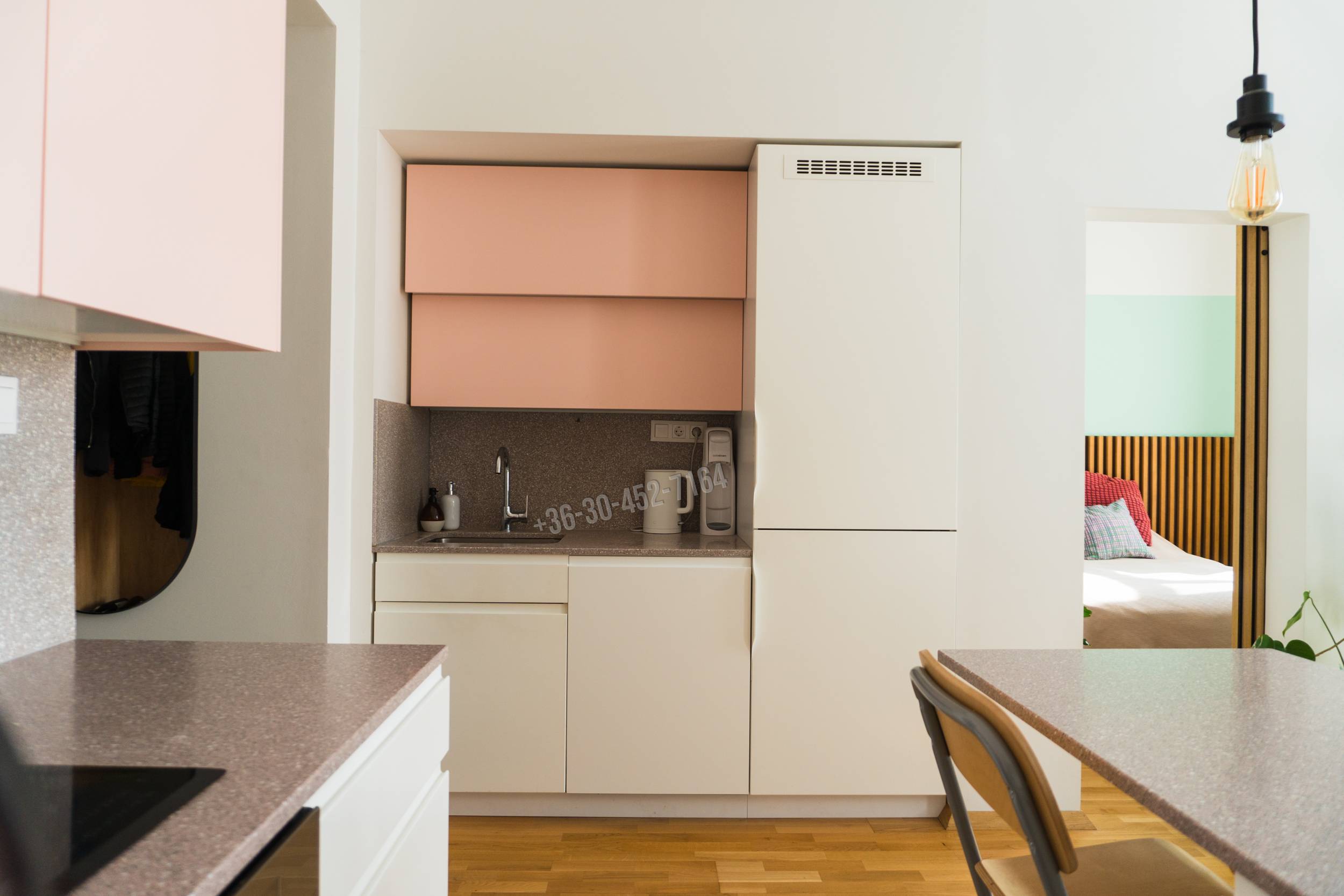 – a lakásban amerikai konyhás nappali lett kialakítva, a konyha bútor minőségi anyagokból, egyedileg gyártott, nem IKEA konyha. A szekrények előlapjai festettek, a konyhapult 100%-ban vízálló műkő (nem bútorlap). Indukciós főzőlappal (Electrolux) valamit beépített sütővel (Ariston) és mikrohullámú sütővel (Ariston) lett felszerelve. Ezen kívül egy nagy (12 terítékes) mosogatógép (Hisense) és egy óriási hűtő-fagyasztó (Samsung) is megtalálható, mindkettő szintén gondosan beépítve a letisztult és elegáns designba illeszkedve.