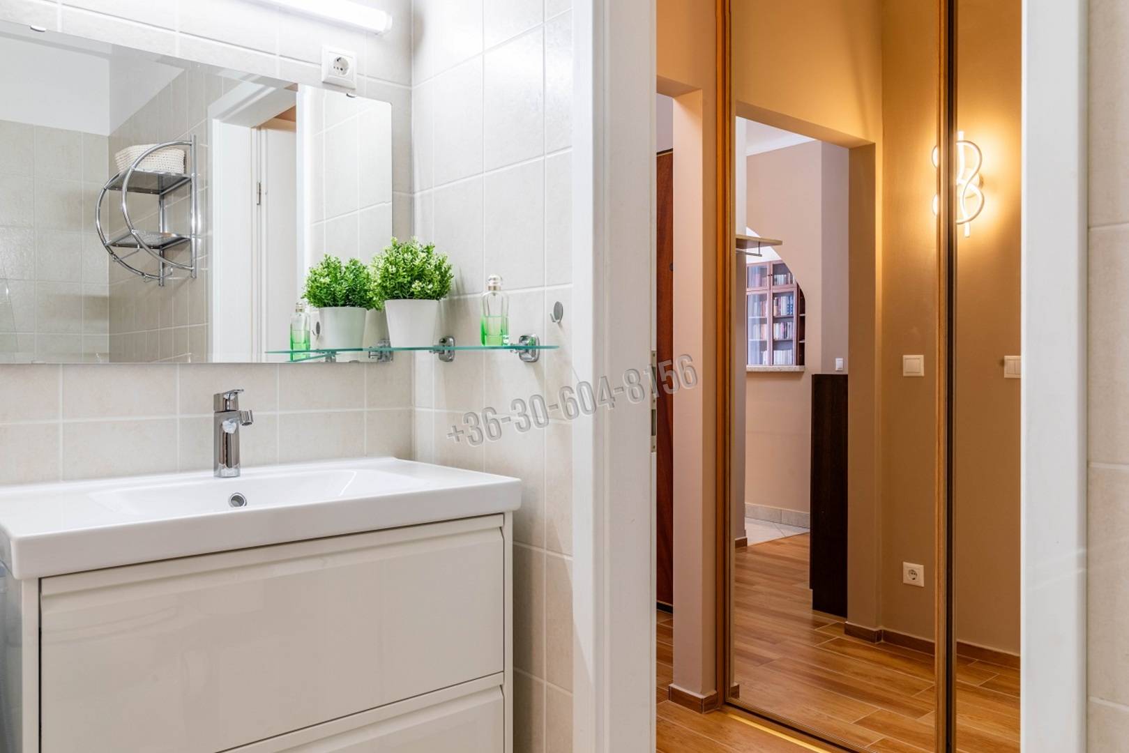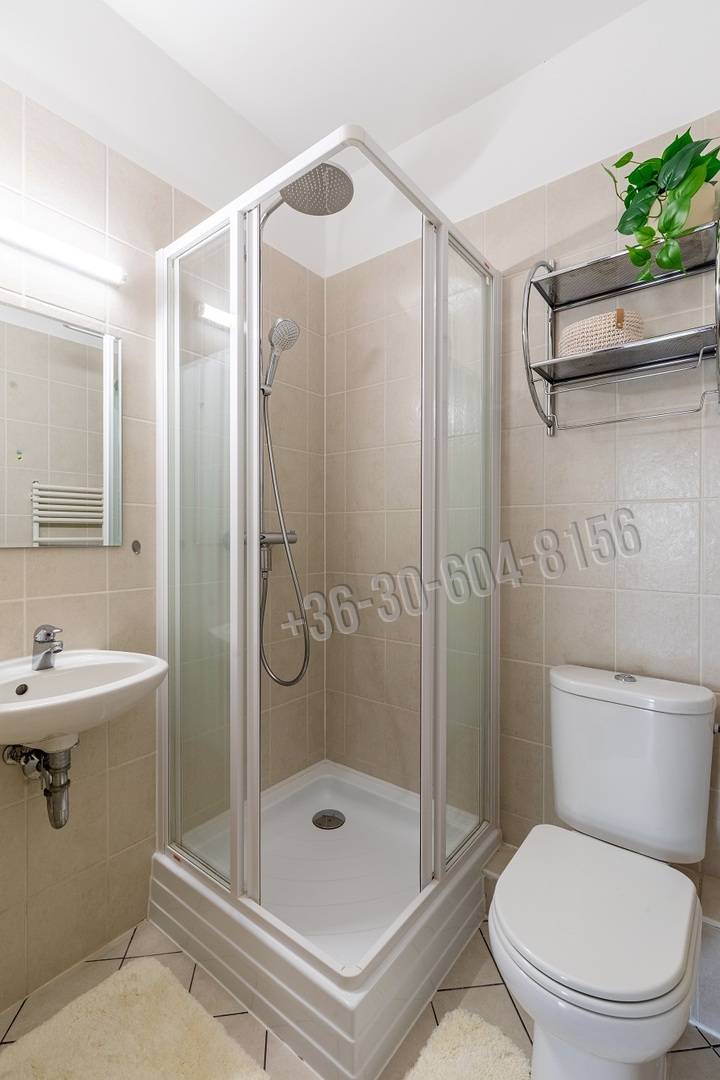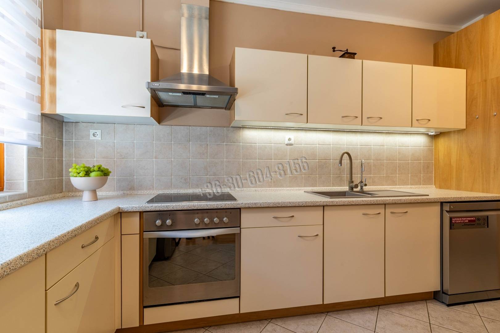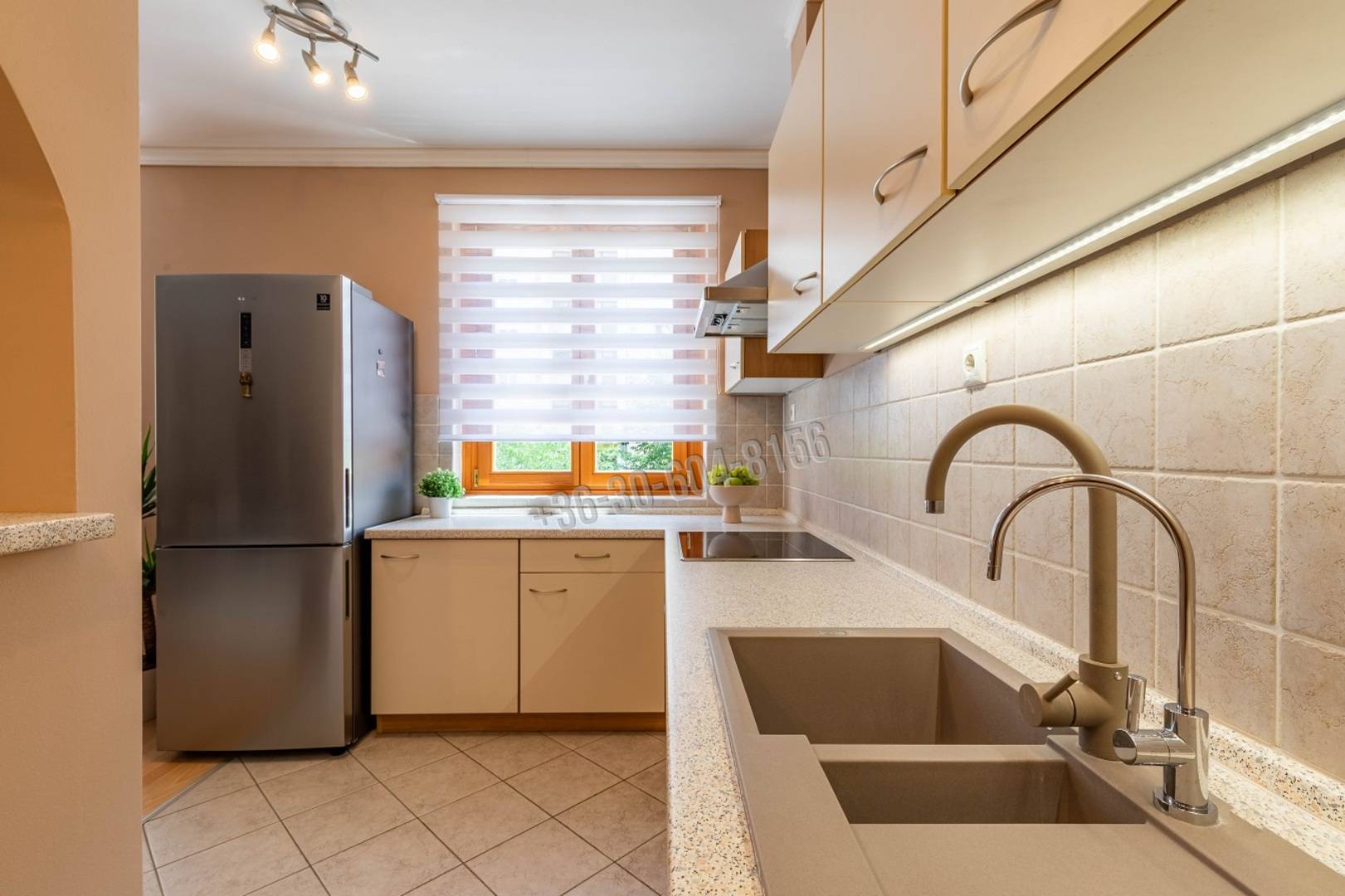Gépesített konyha: kerámia főzőlap, villanysütő, szagelszívó, hűtőszekrény, mosogatógép