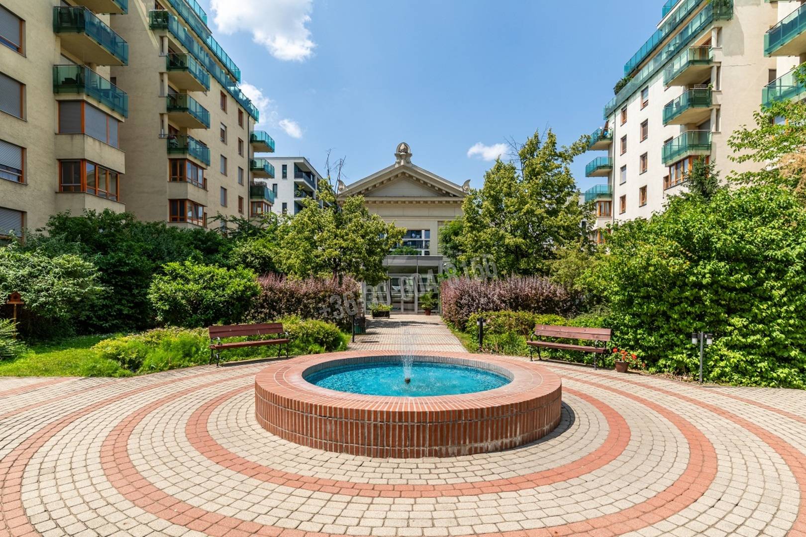 A társasház parkosított, pados, kis szökőkutas kertje könnyen megközekíthető, használható.