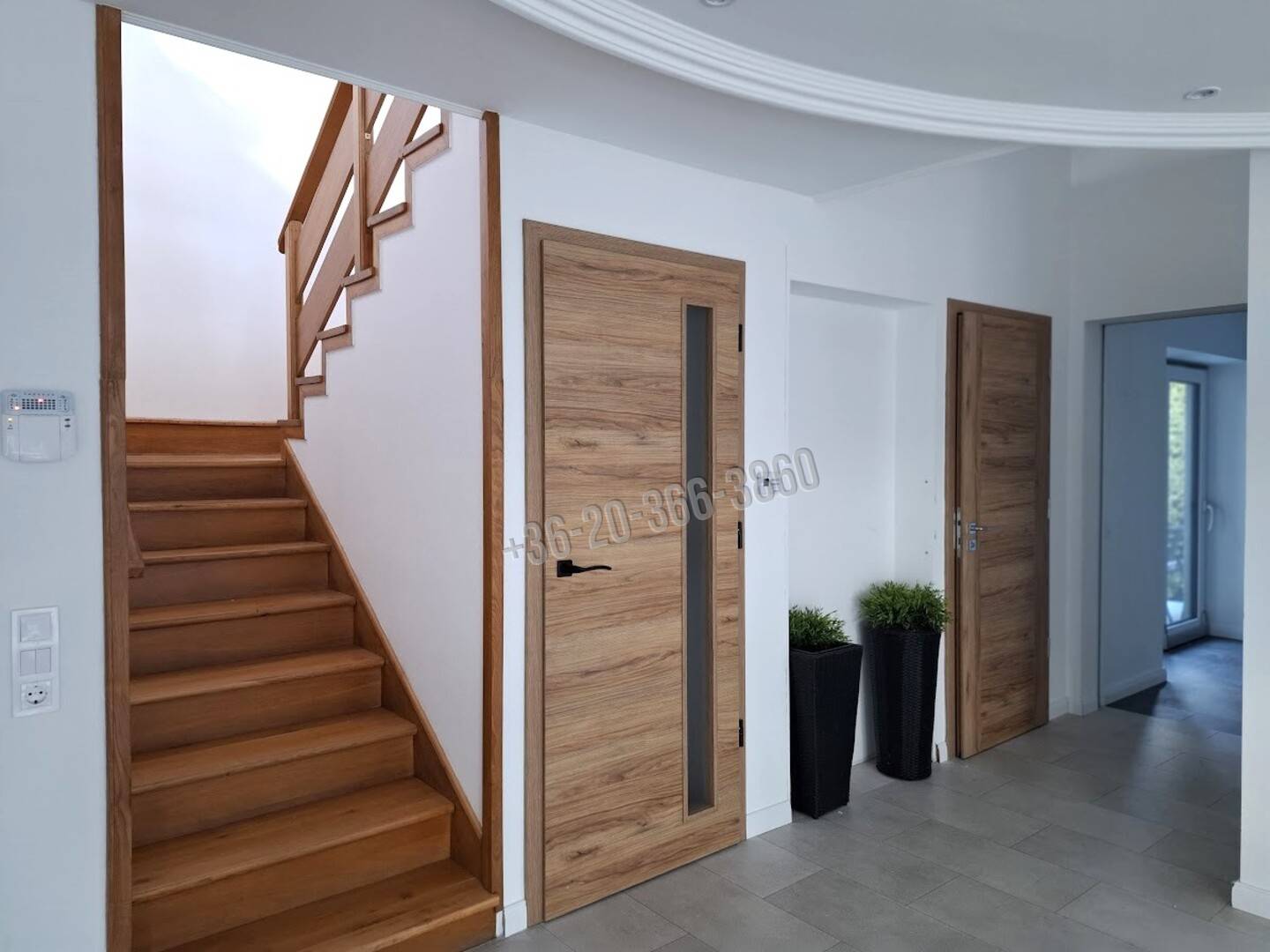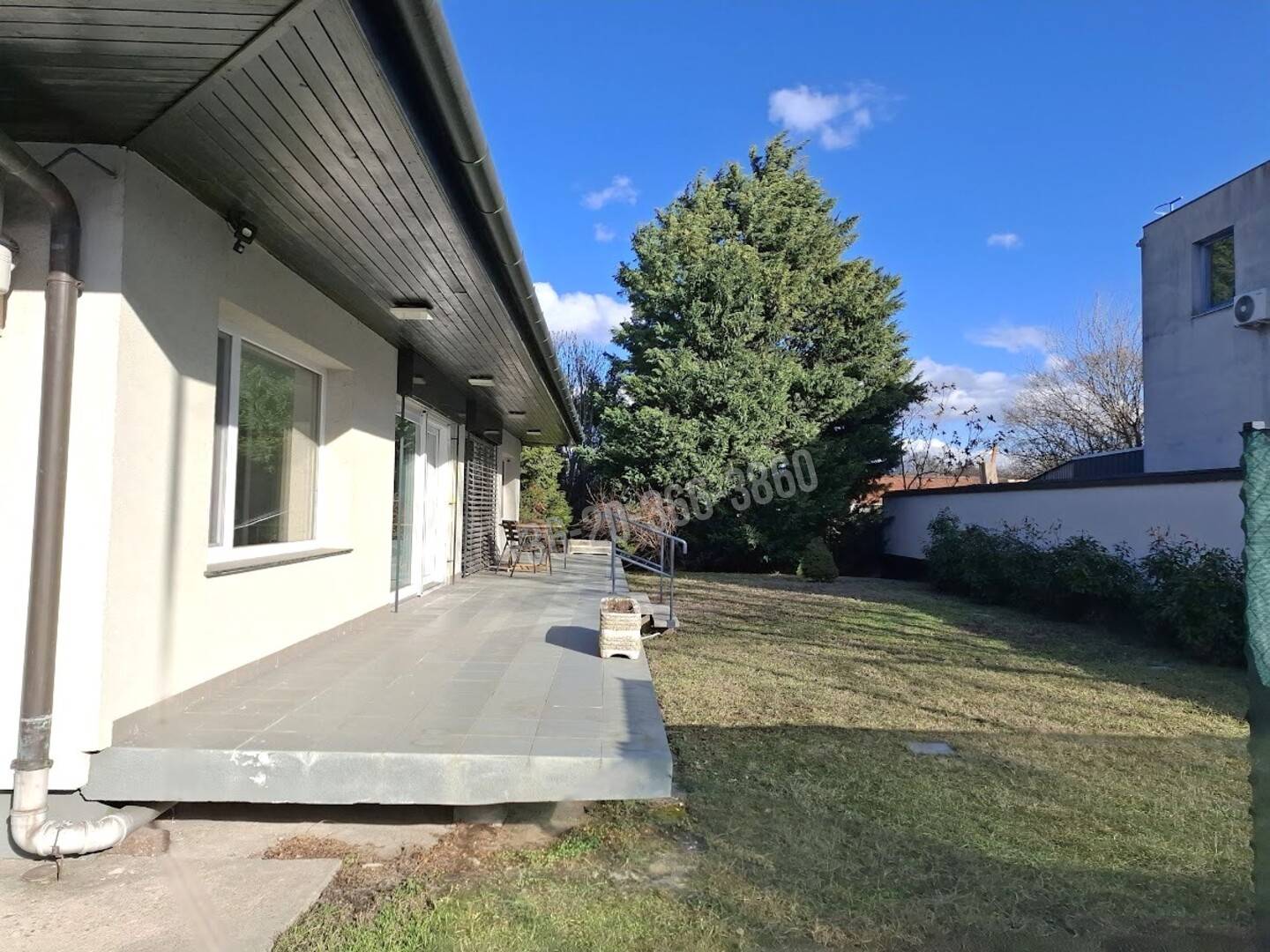 A kb. 155 nm-es lakótérhez csatlakozik egy 37 nm-es D-i fekvésű terasz, egy dupla garázs, és a burkolt területen még sok gépkocsibeállási lehetőség.