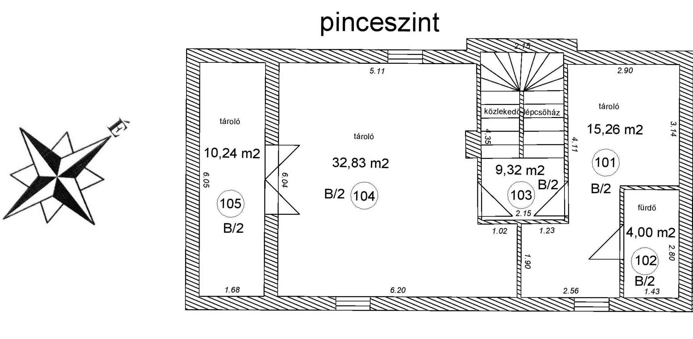 Pinceszint: közlekedő (4,19 nm), szauna helyiség (15 nm), fürdőszoba (5 nm), hobbi/dolgozó/vendég szoba (32,27 nm)