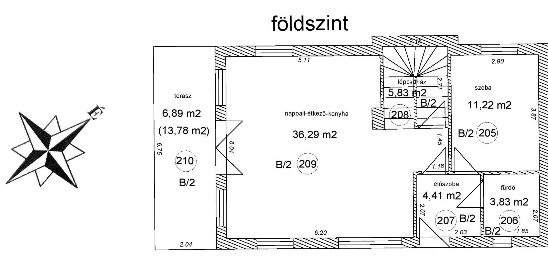 Földszint: előszoba (4,41 nm), nappali – konyha – étkező (36,29 nm), hálószoba (11,22 nm), fürdőszoba (3,83 nm), lépcsőház (5,83 nm), terasz (13,78 nm)