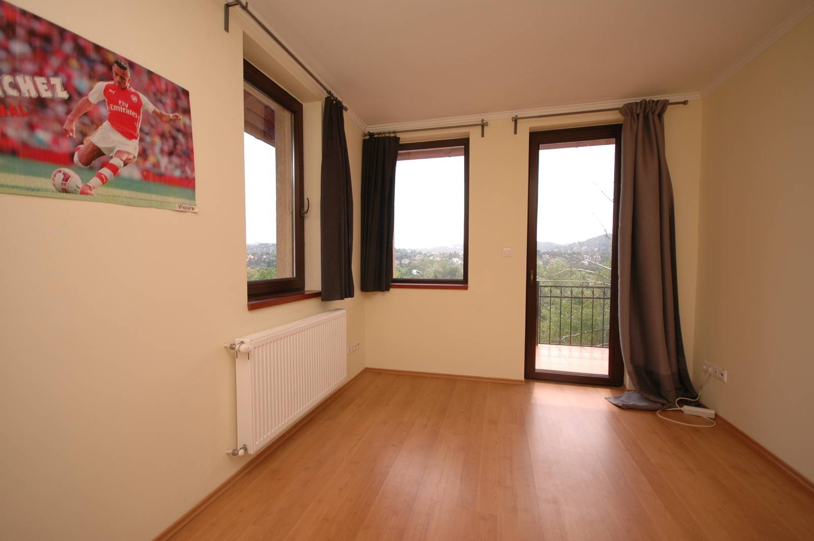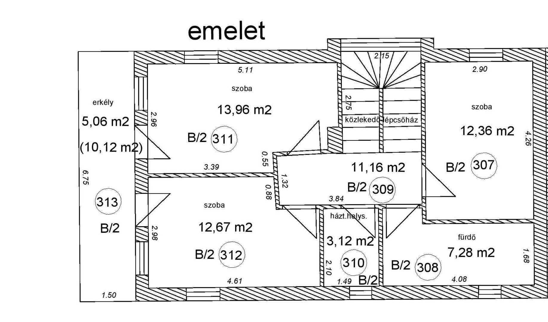Emelet: lépcsőház, közlekedő (11,16 m2), 3 hálószoba (13,96 nm, 12,36 nm, 12,67 nm), fürdőszoba (7,28 m2), gardrób (3,12 m2), terasz (10,12 m2).