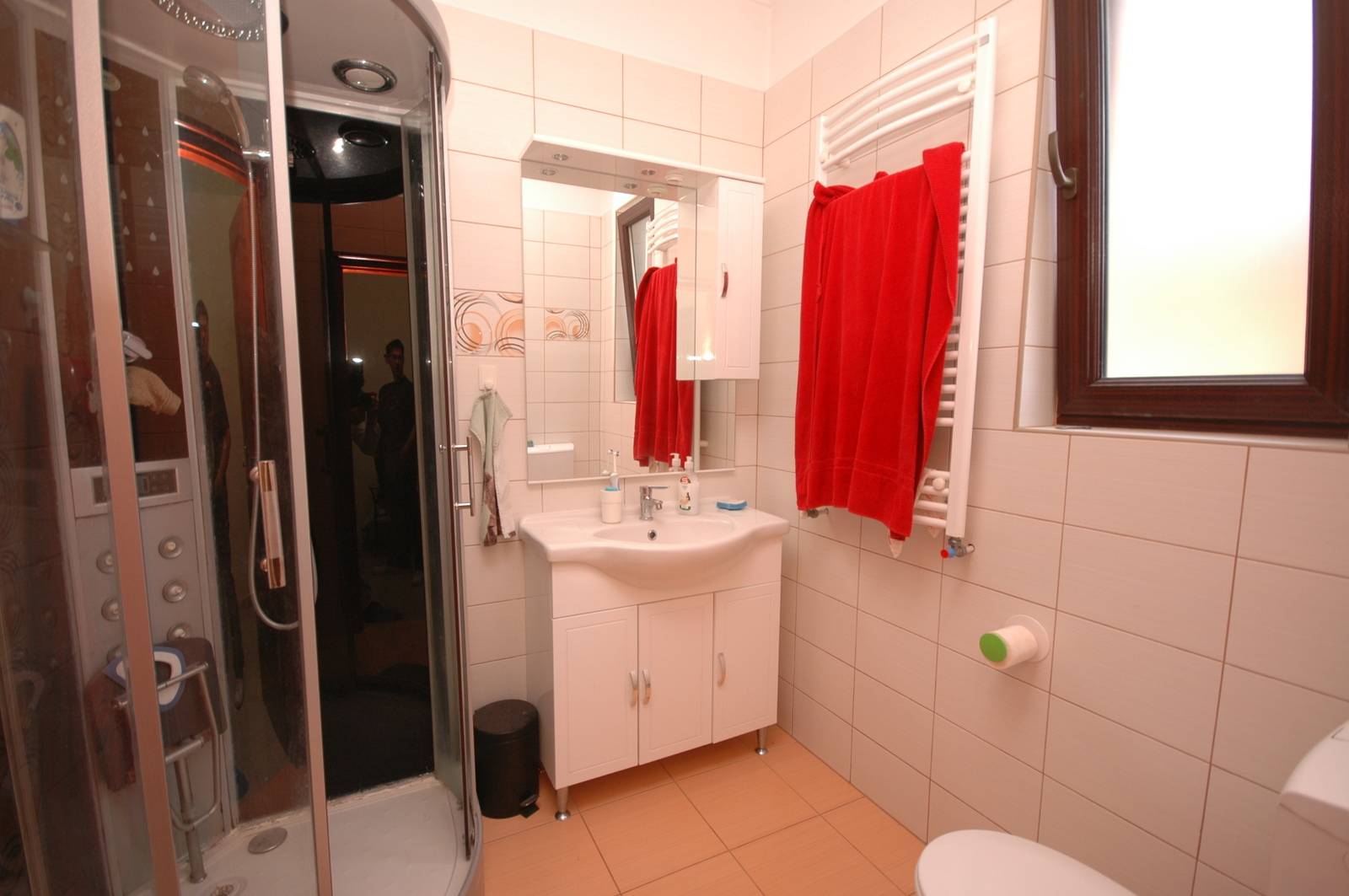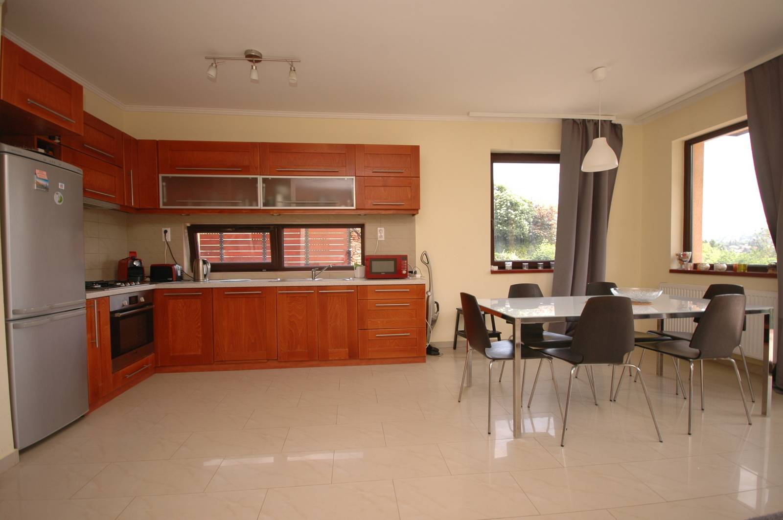 A fűtés kondenzációs gázkazánnal, padló (köves helyiségek) és radiátoros fűtés (hálószobák).