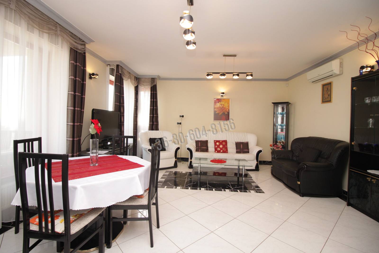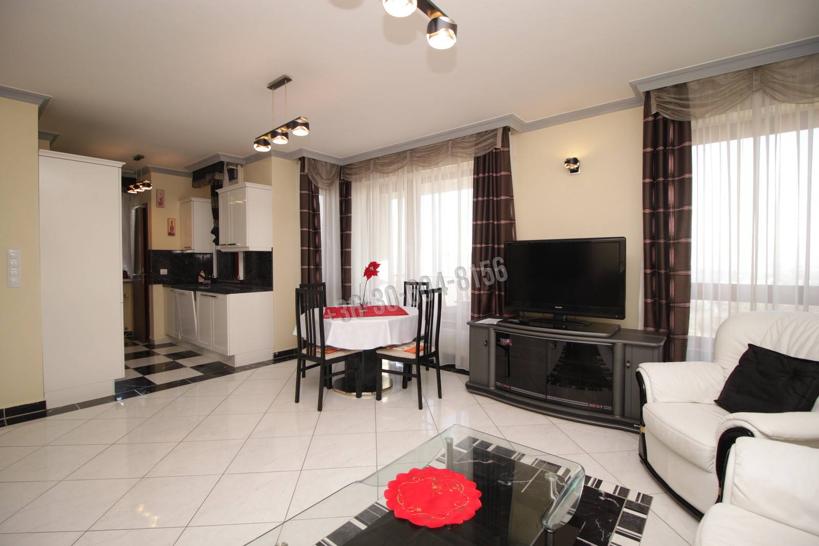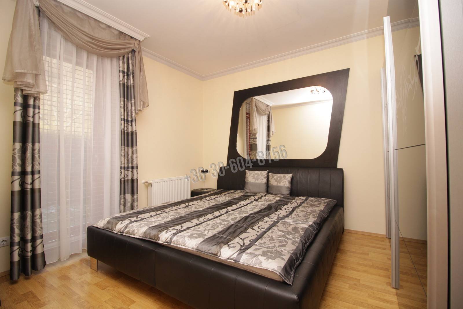 Helyiségek: előszoba, nappali – konyha – étkező, kamra, 2 háló, 2 fürdő, közlekedő, terasz, erkély