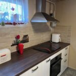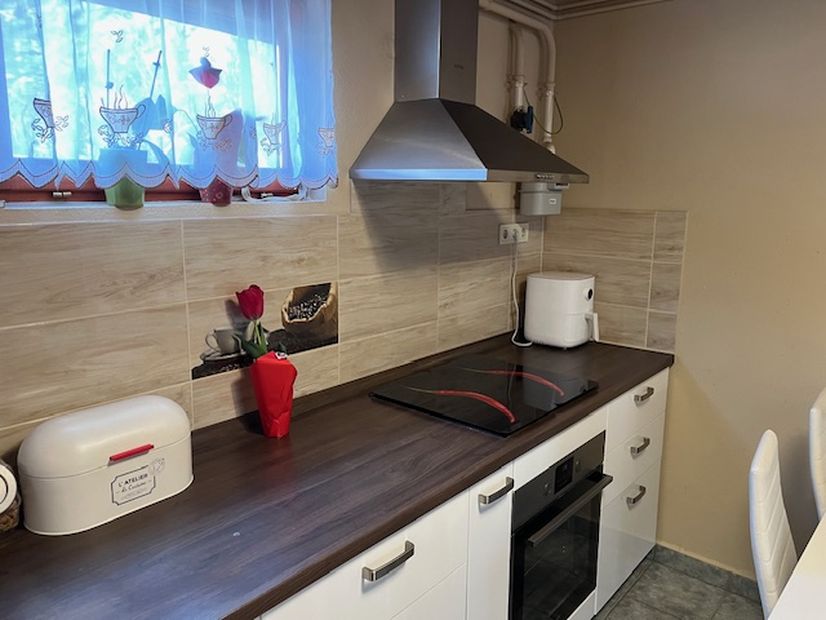 Elosztása: -előszoba,közlekedő, fürdőszoba, amerikai konyhás nappali gépesített Ikea konyhabútorral.Indukciós tűzhely, sütő, mosogtógép, elszívó.