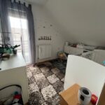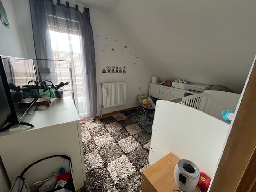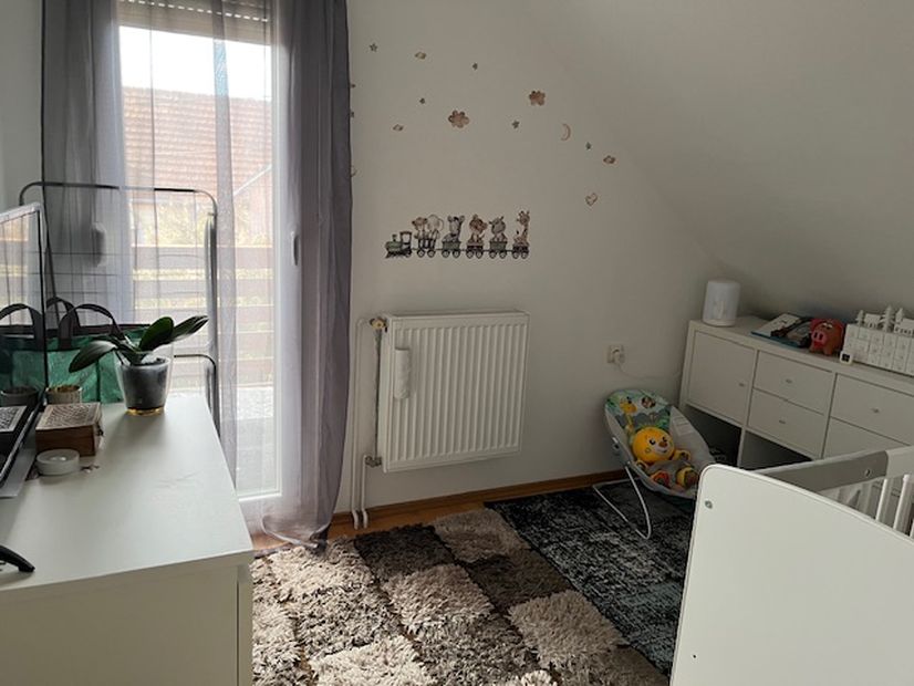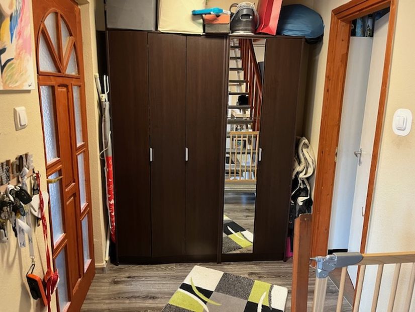 Tetőtérben: nappali (mely jelenleg a szülői hálószoba), 2 külön bejáratú szoba, loggia.